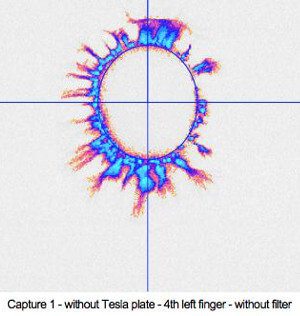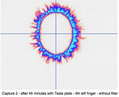 In questo esperimento puoi osservare due immagini del dito anulare sinistro catturate con il GVD prima e dopo l’esposizione alle piastre di Tesla: