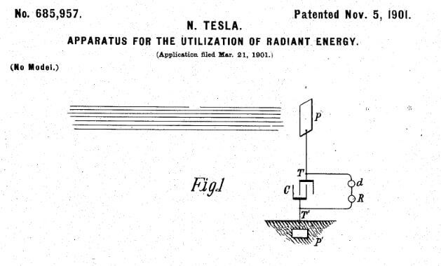 Alla base delle Piastre di Tesla c'è il brevetto di Tesla Nr. 685.957 (che sul certificato è definito "piccolo apparato per l’utilizzazione di Energia Radiante") attraverso cui realizzare queste antenne riceventi e trasmittenti energia cosmica: