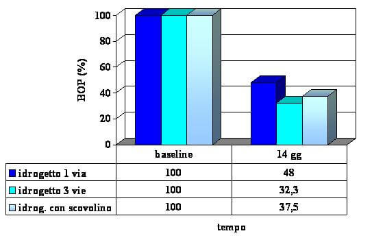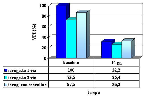 Le variazioni dell’indice di placca hanno mostrato una buona efficacia, con l’effetto maggiore dell’idrogetto ad una via (riduzione dell’indice dal 100% al 32.2%) rispetto all’idrogetto a tre vie (dal 73.5% al 26.4%) e a quello con scovolino (da 87.5% a 33.3%).