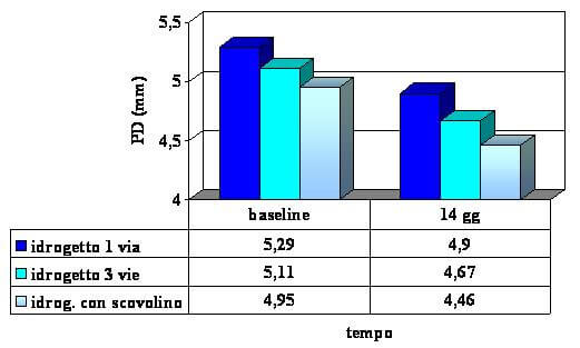 L’indice di sanguinamento si è ridotto nel corso dello studio in tutti i gruppi, in misura maggiore nei gruppi che hanno impiegato l’idrogetto a tre vie e quello con scovolino.