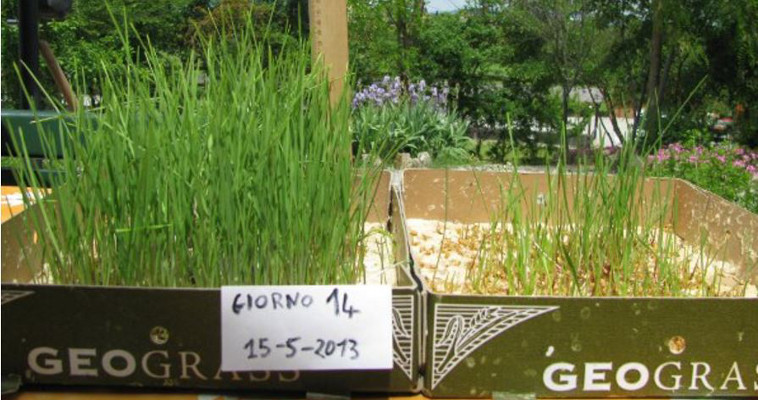 Si è utilizzato un Kit Geograss Bavicchi che è un sistema a vassoi in cui è poggiato un foglio di cellulosa, sulla quale vengono disposti i semi contenuti nel kit stesso. Seguendo le indicazioni del Kit puoi ottenere erba di grano per essere spremuta per la produzione del nutriente Succo Verde.